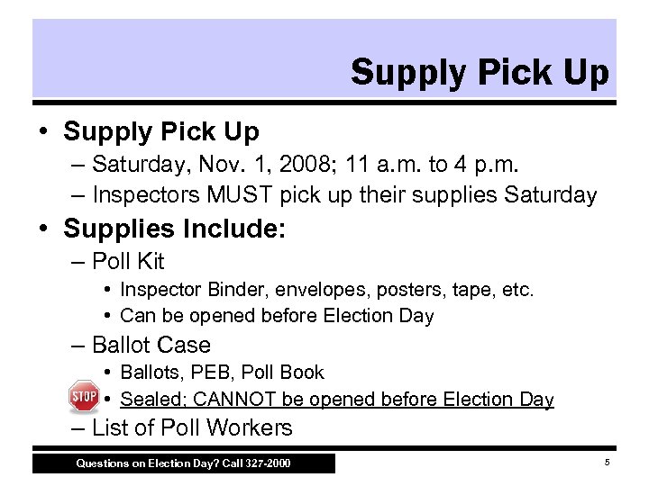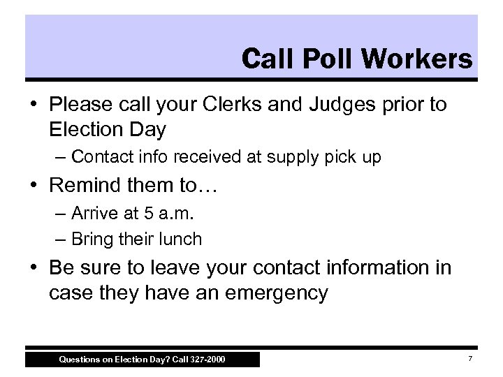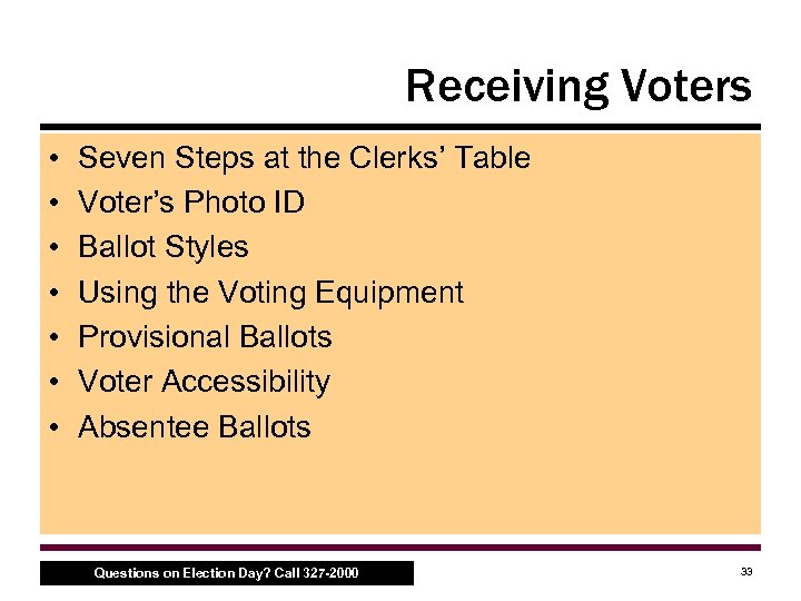 Agenda • • • Before Election Day Opening the Polls Receiving Voters Closing the Polls Review and Reminders Questions on Election Day? Call 327 -2000 2