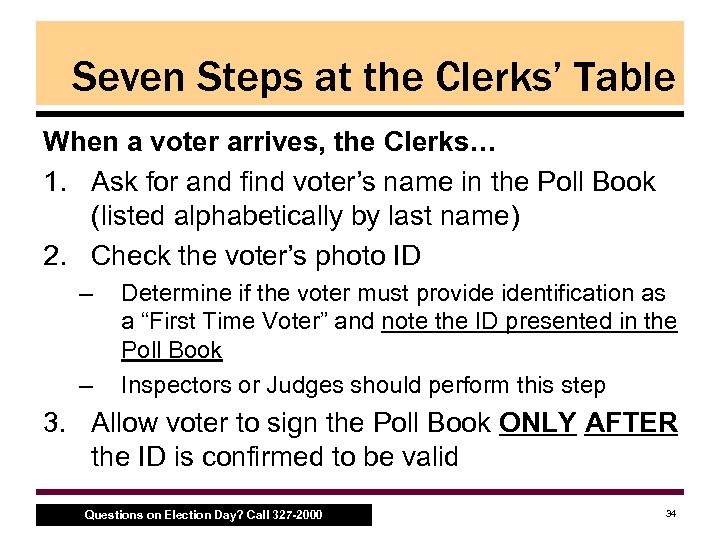Receiving Voters • • Seven Steps at the Clerks’ Table Voter’s Photo ID Ballot Styles Using the Voting Equipment Provisional Ballots Voter Accessibility Absentee Ballots Questions on Election Day? Call 327 -2000 33