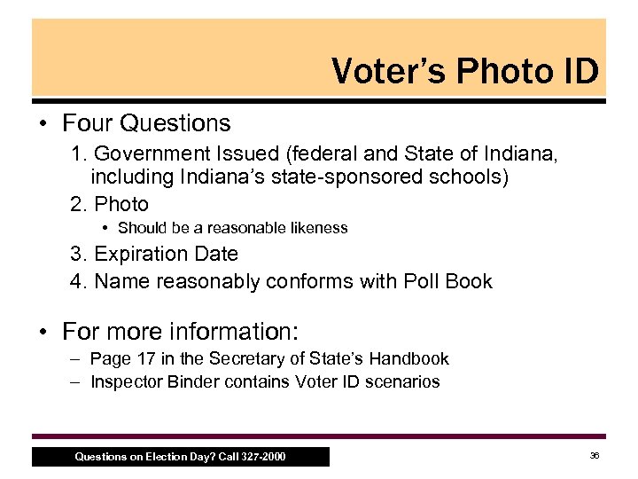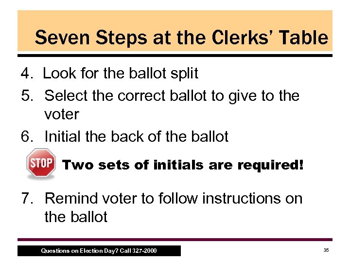 Seven Steps at the Clerks’ Table When a voter arrives, the Clerks… 1. Ask for and find voter’s name in the Poll Book (listed alphabetically by last name) 2. Check the voter’s photo ID – – Determine if the voter must provide identification as a “First Time Voter” and note the ID presented in the Poll Book Inspectors or Judges should perform this step 3. Allow voter to sign the Poll Book ONLY AFTER the ID is confirmed to be valid Questions on Election Day? Call 327 -2000 34