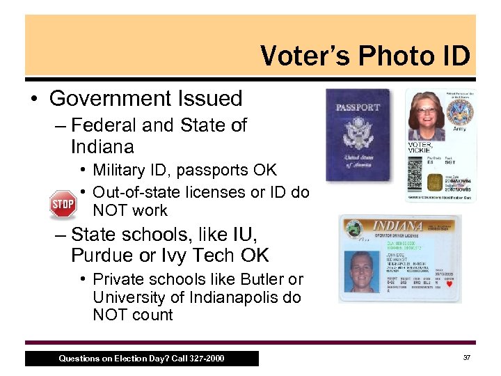 Voter’s Photo ID • Four Questions 1. Government Issued (federal and State of Indiana, including Indiana’s state sponsored schools) 2. Photo • Should be a reasonable likeness 3. Expiration Date 4. Name reasonably conforms with Poll Book • For more information: – Page 17 in the Secretary of State’s Handbook – Inspector Binder contains Voter ID scenarios Questions on Election Day? Call 327 -2000 36