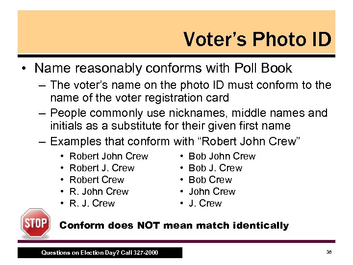 Voter’s Photo ID • Name reasonably conforms with Poll Book – The voter’s name on the photo ID must conform to the name of the voter registration card – People commonly use nicknames, middle names and initials as a substitute for their given first name – Examples that conform with “Robert John Crew” • • • Robert John Crew Robert J. Crew Robert Crew R. John Crew R. J. Crew • • • Bob John Crew Bob J. Crew Bob Crew John Crew J. Crew Conform does NOT mean match identically Questions on Election Day? Call 327 -2000 38