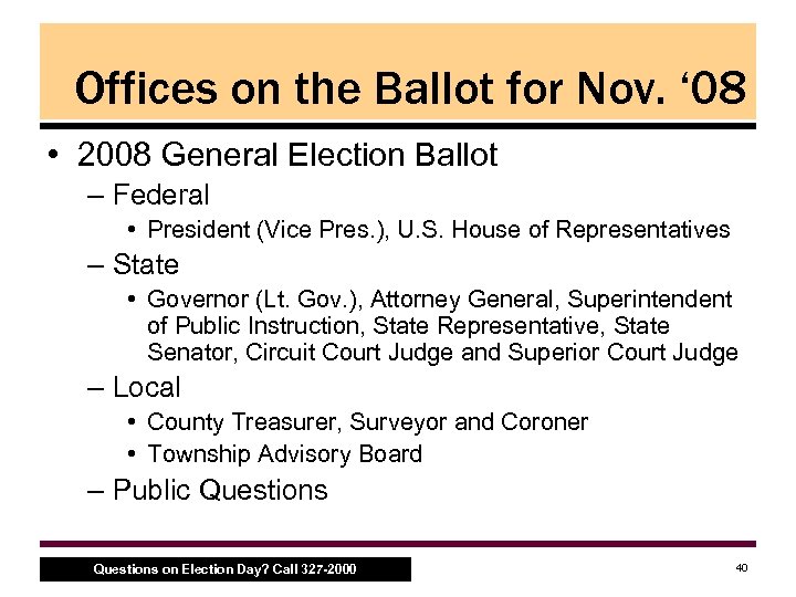 Offices on the Ballot for Nov. ‘ 08 • 2008 General Election Ballot – Federal • President (Vice Pres. ), U. S. House of Representatives – State • Governor (Lt. Gov. ), Attorney General, Superintendent of Public Instruction, State Representative, State Senator, Circuit Court Judge and Superior Court Judge – Local • County Treasurer, Surveyor and Coroner • Township Advisory Board – Public Questions on Election Day? Call 327 -2000 40