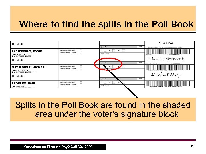 Ballot Styles: Split Precincts • Some precincts may be ‘split, ’ meaning boundaries for elected office divide the precinct – In the Poll Book, the split information is found underneath the box for the voter’s signature. • Splits are denoted with an ‘A, ’ ‘B’ or ‘C’ (see next slide for an example) – Look at the ballot key found in the Ballot Case to determine the proper style. • For example, Ward 1 Precinct 001 Split A may need ballot style number 69 – On the ballot, the ballot style is found in the upper right hand corner. • To confirm, look for the ward and precinct abbreviation on the back of the ballot Questions on Election Day? Call 327 -2000 42