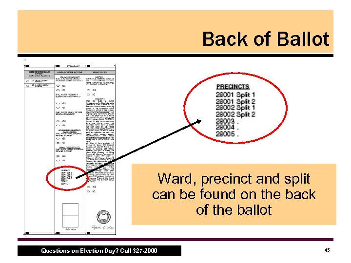 Back of Ballot Ward, precinct and split can be found on the back of the ballot Questions on Election Day? Call 327 -2000 45