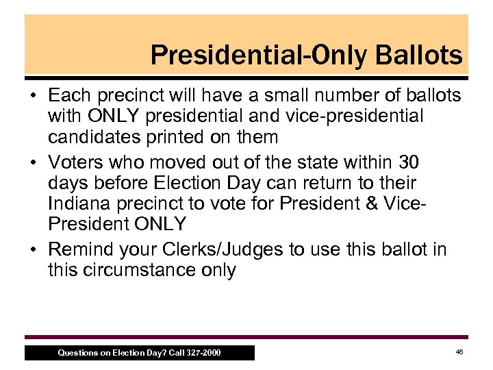 Presidential-Only Ballots • Each precinct will have a small number of ballots with ONLY presidential and vice presidential candidates printed on them • Voters who moved out of the state within 30 days before Election Day can return to their Indiana precinct to vote for President & Vice President ONLY • Remind your Clerks/Judges to use this ballot in this circumstance only Questions on Election Day? Call 327 -2000 46
