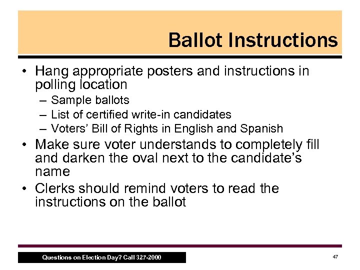 Ballot Instructions • Hang appropriate posters and instructions in polling location – Sample ballots – List of certified write in candidates – Voters’ Bill of Rights in English and Spanish • Make sure voter understands to completely fill and darken the oval next to the candidate’s name • Clerks should remind voters to read the instructions on the ballot Questions on Election Day? Call 327 -2000 47