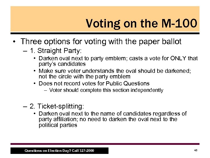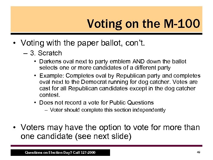 Voting on the M-100 • Three options for voting with the paper ballot – 1. Straight Party: • Darken oval next to party emblem; casts a vote for ONLY that party’s candidates • Make sure voter understands the oval should be darkened; not the circle with the party emblem • Does not record votes for Public Questions – Voter should complete this section independently – 2. Ticket splitting: • Darken oval next to the name of candidates regardless of party affiliation; no need to darken the oval next to the political parties Questions on Election Day? Call 327 -2000 48