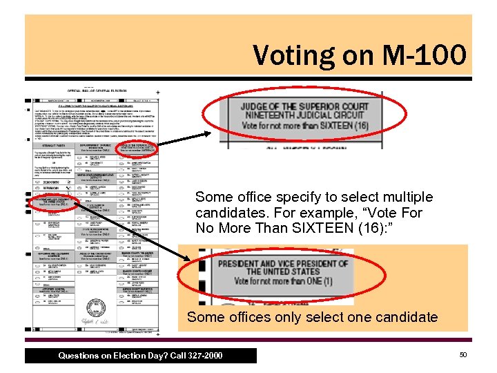 Voting on M-100 Some office specify to select multiple candidates. For example, “Vote For No More Than SIXTEEN (16): ” Some offices only select one candidate Questions on Election Day? Call 327 -2000 50