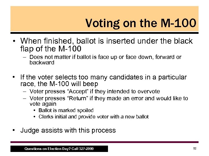 Voting on M-100 • Voting with a paper ballot, con’t. – Write in candidates • Only certified write in candidates will be counted in the election results – Non certified candidates can be written in but will not be counted in the election results • List of certified write in candidates found in Inspector Binder • List of certified write in candidates should be hung in the polling location Questions on Election Day? Call 327 -2000 51