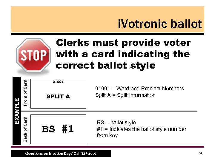 i. Votronic ballot Front of Card Back of Card EXAMPLE Clerks must provide voter with a card indicating the correct ballot style 01001 SPLIT A 01001 = Ward and Precinct Numbers Split A = Split Information BS #1 Questions on Election Day? Call 327 -2000 BS = ballot style #1 = Indicates the ballot style number from key 54