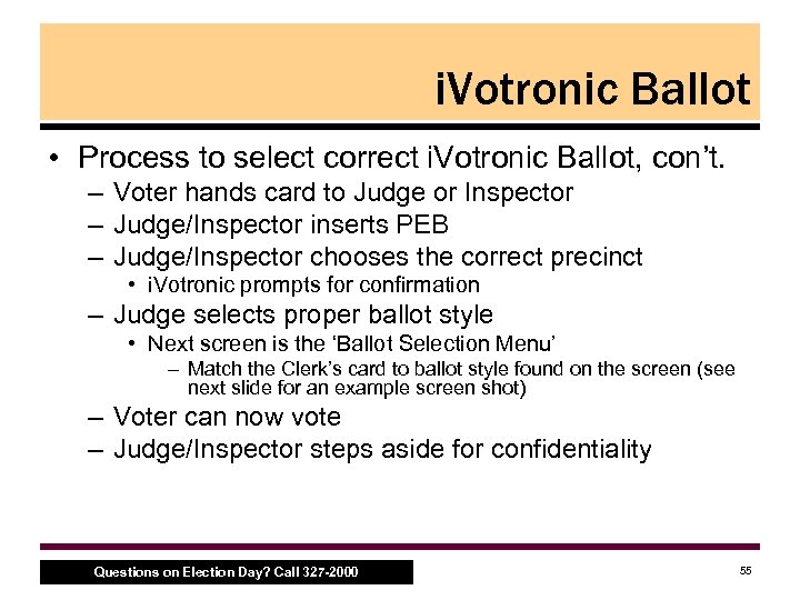 i. Votronic Ballot • Select correct i. Votronic ballot – Clerk finds voter’s name in Poll Book – Clerk determines voter’s proper ballot style following the same procedures as they would for a M 100 ballot • Refer to ballot style key found in Ballot Case • Make sure Clerk is checking the Poll Book for precinct splits – Clerk pulls proper i. Votronic card and gives it to voter • Cards are found in the Inspector Binder Questions on Election Day? Call 327 -2000 53