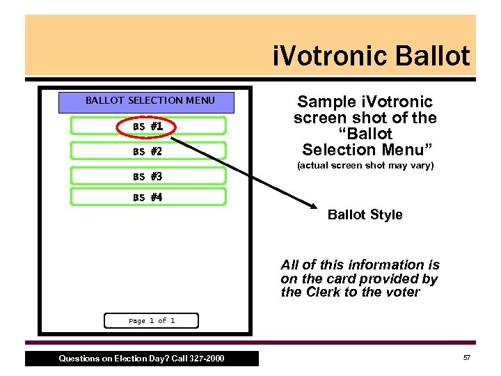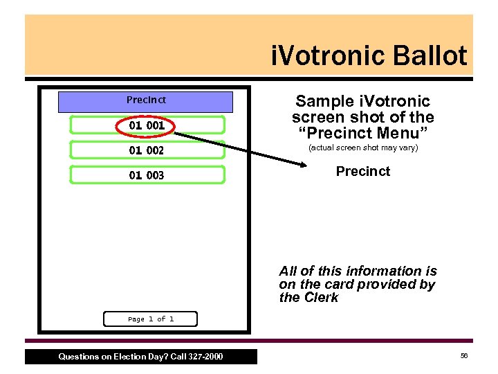 i. Votronic Ballot • Process to select correct i. Votronic Ballot, con’t. – Voter hands card to Judge or Inspector – Judge/Inspector inserts PEB – Judge/Inspector chooses the correct precinct • i. Votronic prompts for confirmation – Judge selects proper ballot style • Next screen is the ‘Ballot Selection Menu’ – Match the Clerk’s card to ballot style found on the screen (see next slide for an example screen shot) – Voter can now vote – Judge/Inspector steps aside for confidentiality Questions on Election Day? Call 327 -2000 55