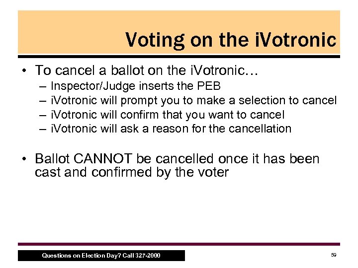 Voting on the i. Votronic • Instruction screen explains how to vote on the i. Votronic • Voter touches the screen and ballot appears • Voter makes their candidate selections and scrolls through their ballot • Voter presses the “VOTE” button at the top of the screen when they’ve finished their selections • i. Votronic will confirm the voter’s selection • i. Votronic gives voter a review screen and asks voter to confirm selections • Voter must not leave polling site without confirming selections or else the ballot must be cancelled Questions on Election Day? Call 327 -2000 58