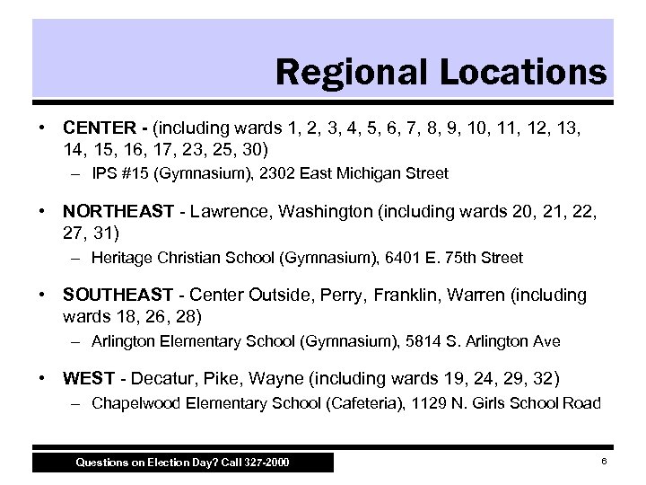 Regional Locations • CENTER - (including wards 1, 2, 3, 4, 5, 6, 7, 8, 9, 10, 11, 12, 13, 14, 15, 16, 17, 23, 25, 30) – IPS #15 (Gymnasium), 2302 East Michigan Street • NORTHEAST Lawrence, Washington (including wards 20, 21, 22, 27, 31) – Heritage Christian School (Gymnasium), 6401 E. 75 th Street • SOUTHEAST Center Outside, Perry, Franklin, Warren (including wards 18, 26, 28) – Arlington Elementary School (Gymnasium), 5814 S. Arlington Ave • WEST Decatur, Pike, Wayne (including wards 19, 24, 29, 32) – Chapelwood Elementary School (Cafeteria), 1129 N. Girls School Road Questions on Election Day? Call 327 -2000 6
