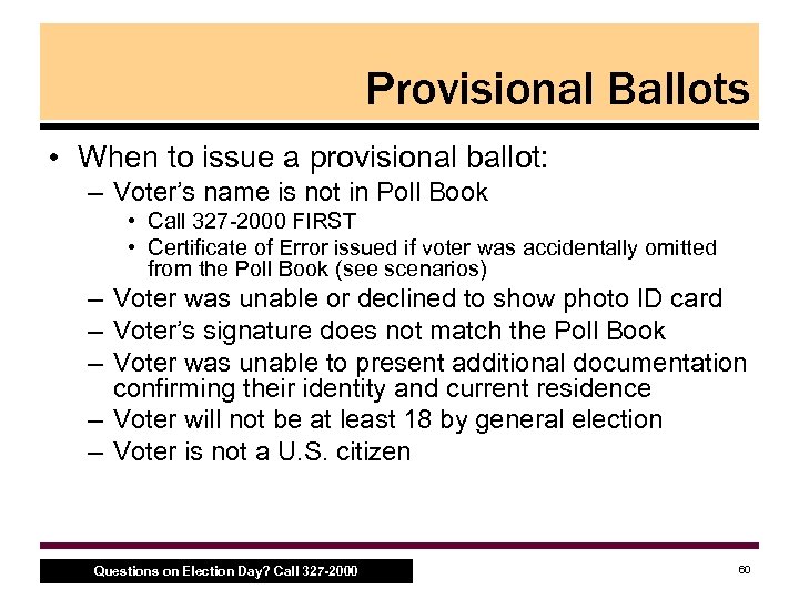 Provisional Ballots • When to issue a provisional ballot: – Voter’s name is not in Poll Book • Call 327 2000 FIRST • Certificate of Error issued if voter was accidentally omitted from the Poll Book (see scenarios) – Voter was unable or declined to show photo ID card – Voter’s signature does not match the Poll Book – Voter was unable to present additional documentation confirming their identity and current residence – Voter will not be at least 18 by general election – Voter is not a U. S. citizen Questions on Election Day? Call 327 -2000 60
