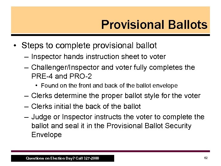 Provisional Ballots • Provisional Ballot Kit – Found in the Inspector’s Poll Kit – Contains: • provisional ballot envelopes • provisional ballot labels • sets of instructions (PRO 9) for the voter • Use voter’s correct M 100 ballot – There is no ‘special’ provisional ballot – Be sure to place ‘provisional ballot’ sticker on the proper M 100 ballot in a empty location on the front or back of the ballot before handing it to voter Questions on Election Day? Call 327 -2000 61