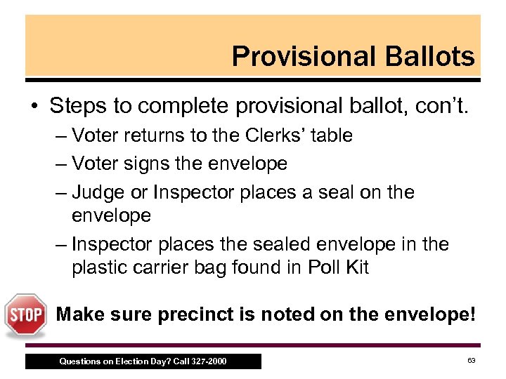 Provisional Ballots • Steps to complete provisional ballot – Inspector hands instruction sheet to voter – Challenger/Inspector and voter fully completes the PRE 4 and PRO 2 • Found on the front and back of the ballot envelope – Clerks determine the proper ballot style for the voter – Clerks initial the back of the ballot – Judge or Inspector instructs the voter to complete the ballot and seal it in the Provisional Ballot Security Envelope Questions on Election Day? Call 327 -2000 62