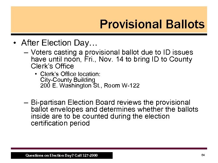 Provisional Ballots • Steps to complete provisional ballot, con’t. – Voter returns to the Clerks’ table – Voter signs the envelope – Judge or Inspector places a seal on the envelope – Inspector places the sealed envelope in the plastic carrier bag found in Poll Kit Make sure precinct is noted on the envelope! Questions on Election Day? Call 327 -2000 63