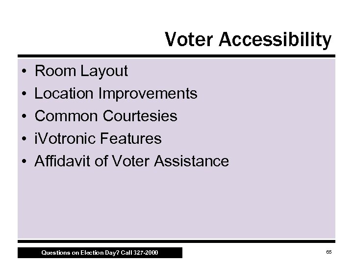Voter Accessibility • • • Room Layout Location Improvements Common Courtesies i. Votronic Features Affidavit of Voter Assistance Questions on Election Day? Call 327 -2000 65