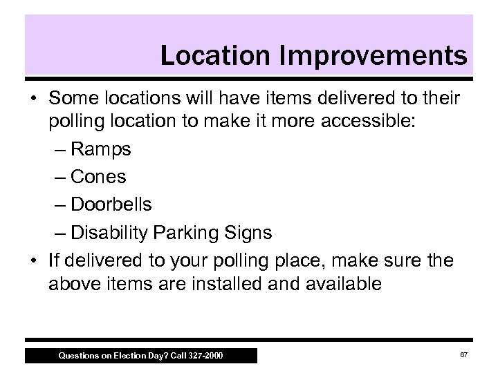 Room Layout • Arrange polling place to allow for smooth traffic flow • Provide an unobstructed and easy to navigate path for voters with disabilities • Allow approximately five square feet for a wheelchair to navigate around the voting equipment • Verify voter accessibility station is private Questions on Election Day? Call 327 -2000 66