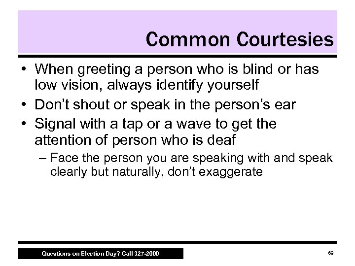 Common Courtesies • Always ask first if a person with a disability needs your help – Assist a person who is blind by offering your arm or shoulder for the person to hold as you guide them to a voting machine • Always look and speak directly at a person with a disability, not the interpreter, companion or helper Questions on Election Day? Call 327 -2000 68