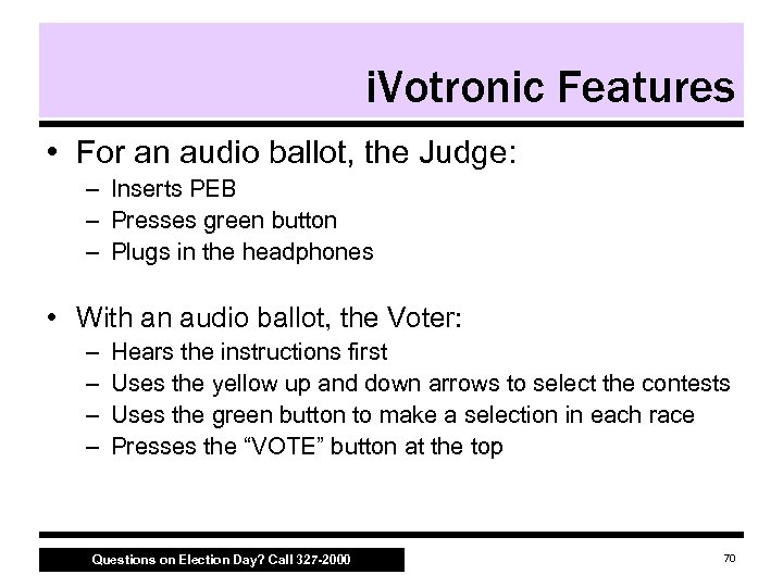 i. Votronic Features • For an audio ballot, the Judge: – Inserts PEB – Presses green button – Plugs in the headphones • With an audio ballot, the Voter: – – Hears the instructions first Uses the yellow up and down arrows to select the contests Uses the green button to make a selection in each race Presses the “VOTE” button at the top Questions on Election Day? Call 327 -2000 70