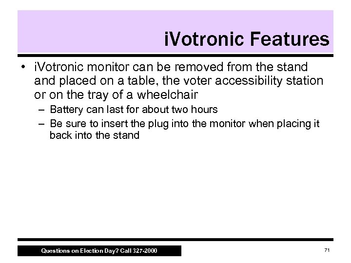 i. Votronic Features • i. Votronic monitor can be removed from the stand placed on a table, the voter accessibility station or on the tray of a wheelchair – Battery can last for about two hours – Be sure to insert the plug into the monitor when placing it back into the stand Questions on Election Day? Call 327 -2000 71