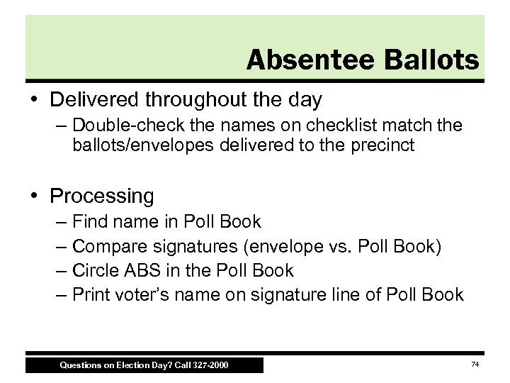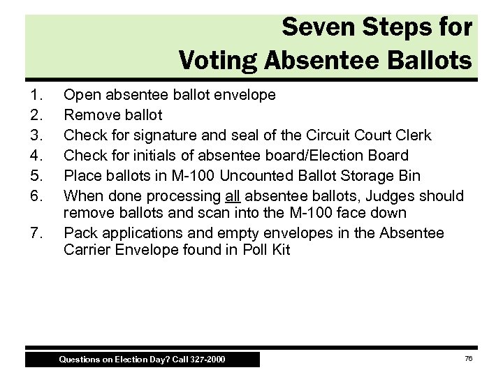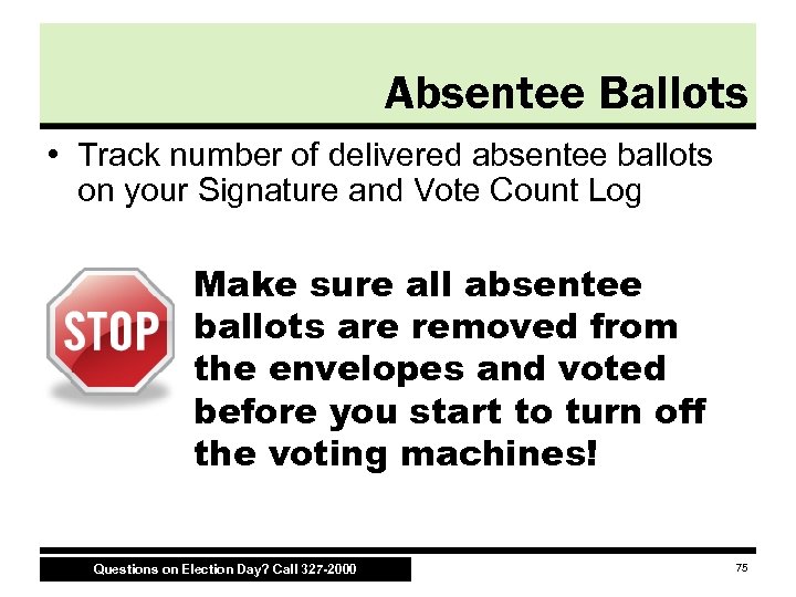 Absentee Ballots • Track number of delivered absentee ballots on your Signature and Vote Count Log Make sure all absentee ballots are removed from the envelopes and voted before you start to turn off the voting machines! Questions on Election Day? Call 327 -2000 75