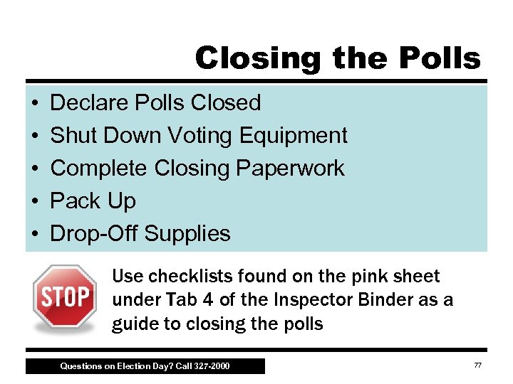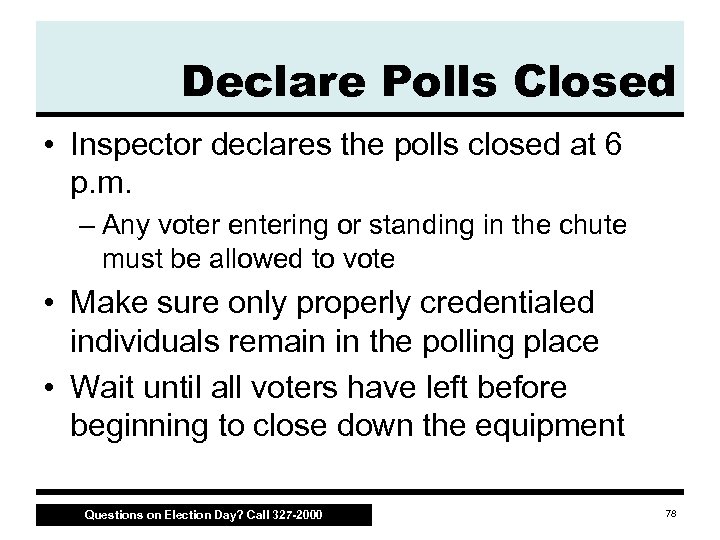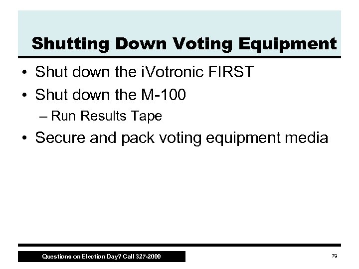 Declare Polls Closed • Inspector declares the polls closed at 6 p. m. – Any voter entering or standing in the chute must be allowed to vote • Make sure only properly credentialed individuals remain in the polling place • Wait until all voters have left before beginning to close down the equipment Questions on Election Day? Call 327 -2000 78