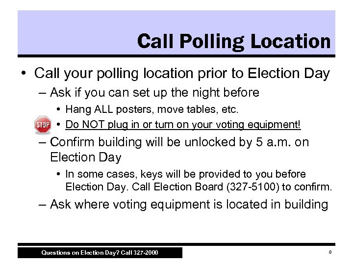 Call Poll Workers • Please call your Clerks and Judges prior to Election Day – Contact info received at supply pick up • Remind them to… – Arrive at 5 a. m. – Bring their lunch • Be sure to leave your contact information in case they have an emergency Questions on Election Day? Call 327 -2000 7