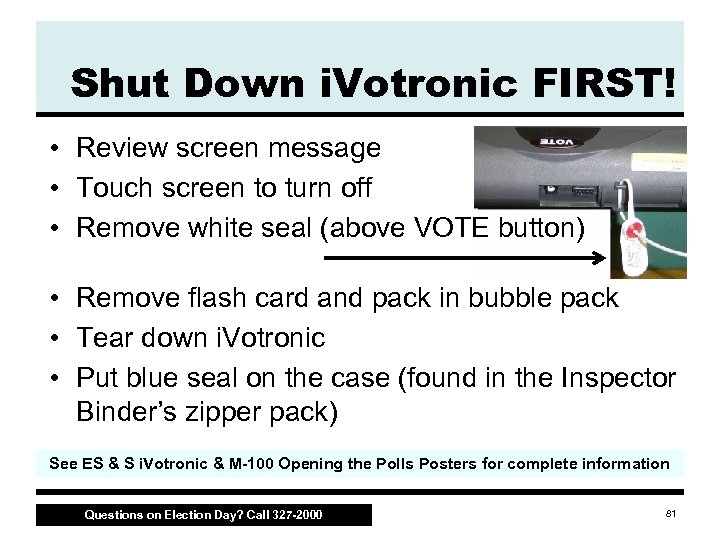 Shut Down i. Votronic FIRST! • Insert PEB • “Close Polls Now” option will automatically appear after 6 p. m. – If a voter is in the chute at 6 p. m. and wants to vote on the i. Votronic, press “Exit this menu” and proceed with voting – If the polls close promptly at 6 p. m. , follow the screen messages DO NOT REMOVE PEB until instructed See ES & S i. Votronic & M-100 Opening the Polls Posters for complete information Questions on Election Day? Call 327 -2000 80