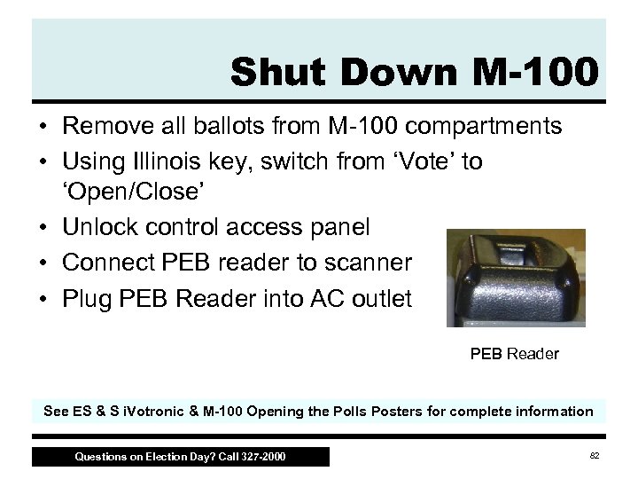 Shut Down M-100 • Remove all ballots from M 100 compartments • Using Illinois key, switch from ‘Vote’ to ‘Open/Close’ • Unlock control access panel • Connect PEB reader to scanner • Plug PEB Reader into AC outlet PEB Reader See ES & S i. Votronic & M-100 Opening the Polls Posters for complete information Questions on Election Day? Call 327 -2000 82