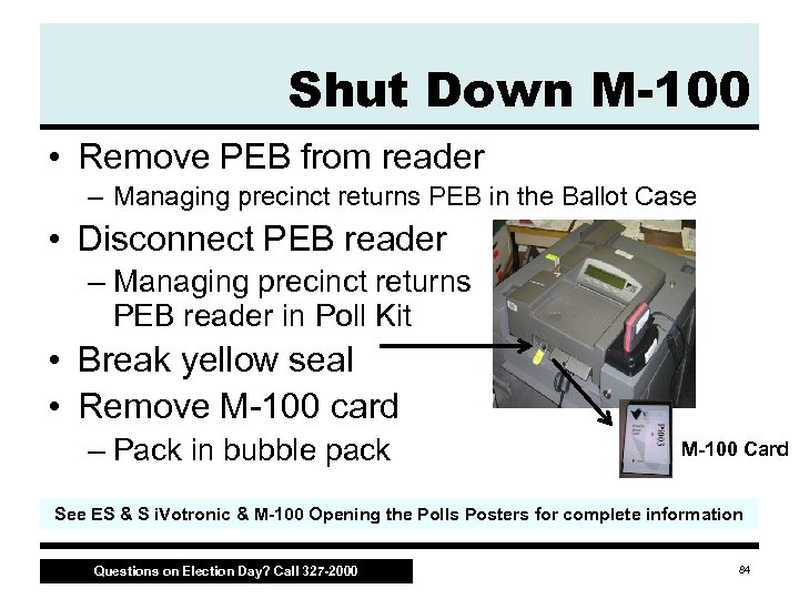Shut Down M-100 • Press ‘Close Polls’ button on M 100 scanner • Insert PEB into PEB reader • Select continue on M 100 scanner • Print results total tape (automatic) – – Inspector and Judge(s) sign one copy Put signed copy in ENVELOPE Print additional totals tapes upon request OK to read results out loud • Turn key to OFF See ES & S i. Votronic & M-100 Opening the Polls Posters for complete information Questions on Election Day? Call 327 -2000 83