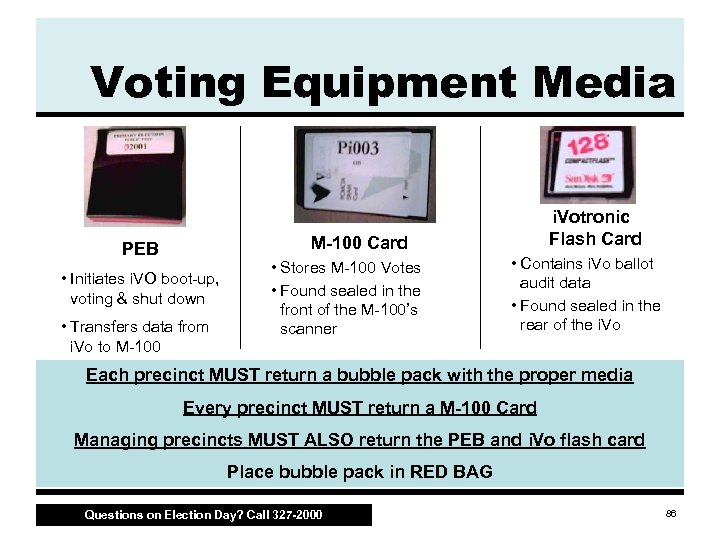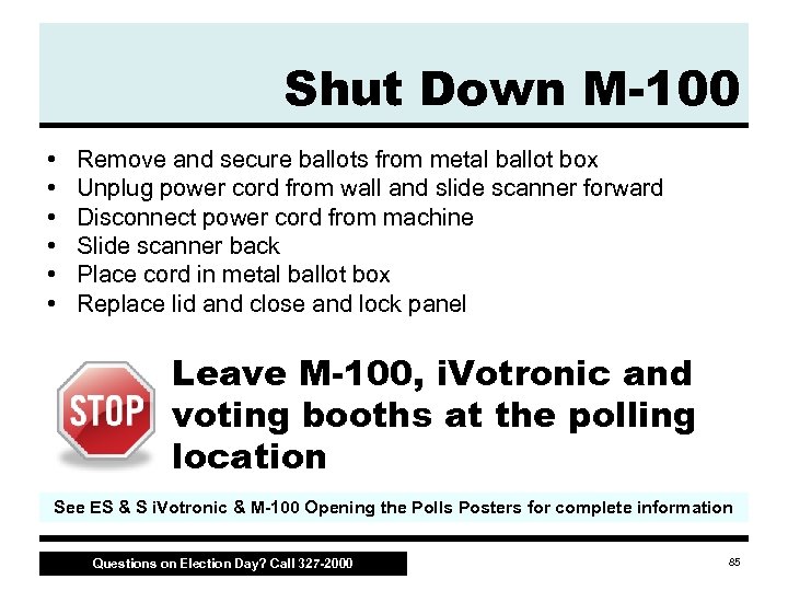 Shut Down M-100 • Remove PEB from reader – Managing precinct returns PEB in the Ballot Case • Disconnect PEB reader – Managing precinct returns PEB reader in Poll Kit • Break yellow seal • Remove M 100 card – Pack in bubble pack M-100 Card See ES & S i. Votronic & M-100 Opening the Polls Posters for complete information Questions on Election Day? Call 327 -2000 84