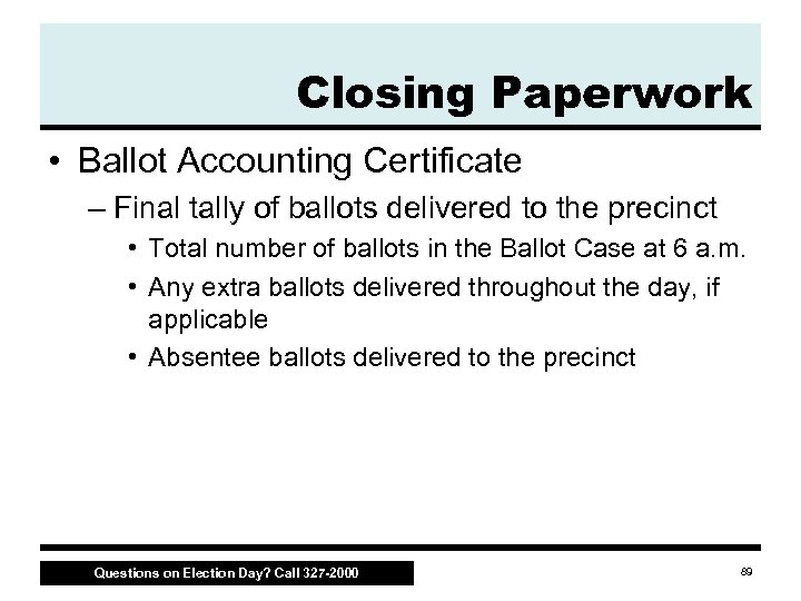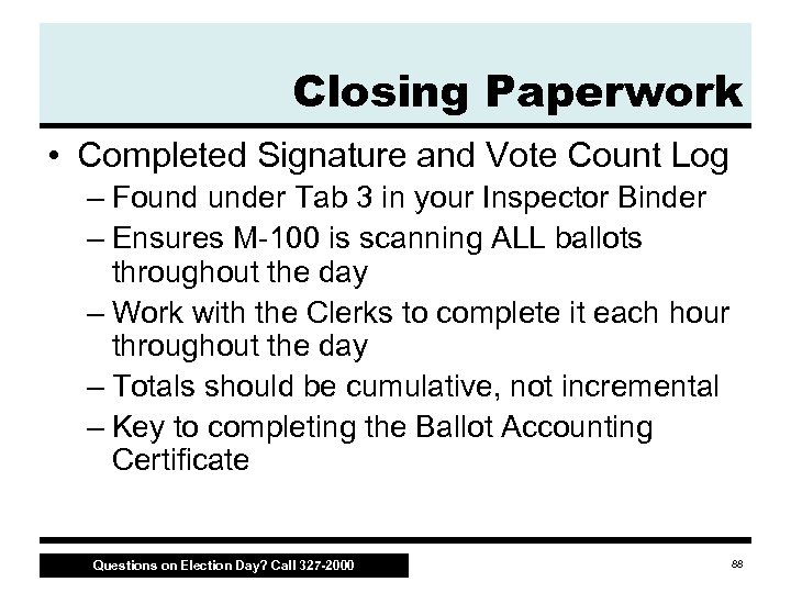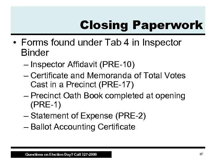 Closing Paperwork • Forms found under Tab 4 in Inspector Binder – Inspector Affidavit (PRE 10) – Certificate and Memoranda of Total Votes Cast in a Precinct (PRE 17) – Precinct Oath Book completed at opening (PRE 1) – Statement of Expense (PRE 2) – Ballot Accounting Certificate Questions on Election Day? Call 327 -2000 87