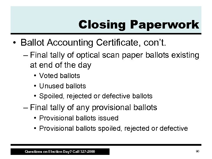 Closing Paperwork • Ballot Accounting Certificate – Final tally of ballots delivered to the precinct • Total number of ballots in the Ballot Case at 6 a. m. • Any extra ballots delivered throughout the day, if applicable • Absentee ballots delivered to the precinct Questions on Election Day? Call 327 -2000 89