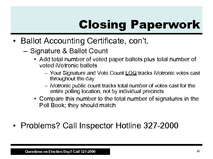 Closing Paperwork • Ballot Accounting Certificate, con’t. – Final tally of optical scan paper ballots existing at end of the day • Voted ballots • Unused ballots • Spoiled, rejected or defective ballots – Final tally of any provisional ballots • Provisional ballots issued • Provisional ballots spoiled, rejected or defective Questions on Election Day? Call 327 -2000 90