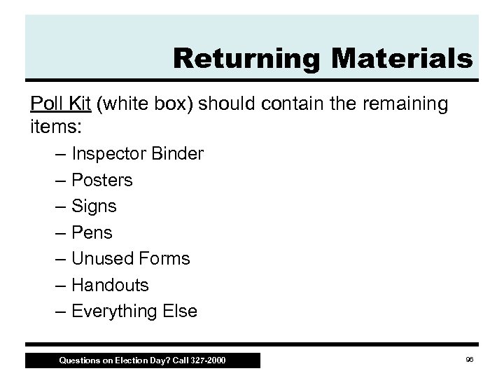 Returning Materials Poll Kit (white box) should contain the remaining items: – Inspector Binder – Posters – Signs – Pens – Unused Forms – Handouts – Everything Else Questions on Election Day? Call 327 -2000 96
