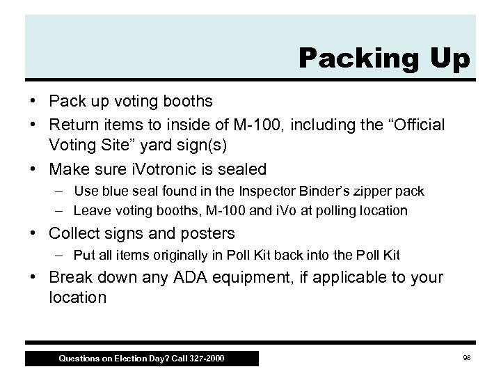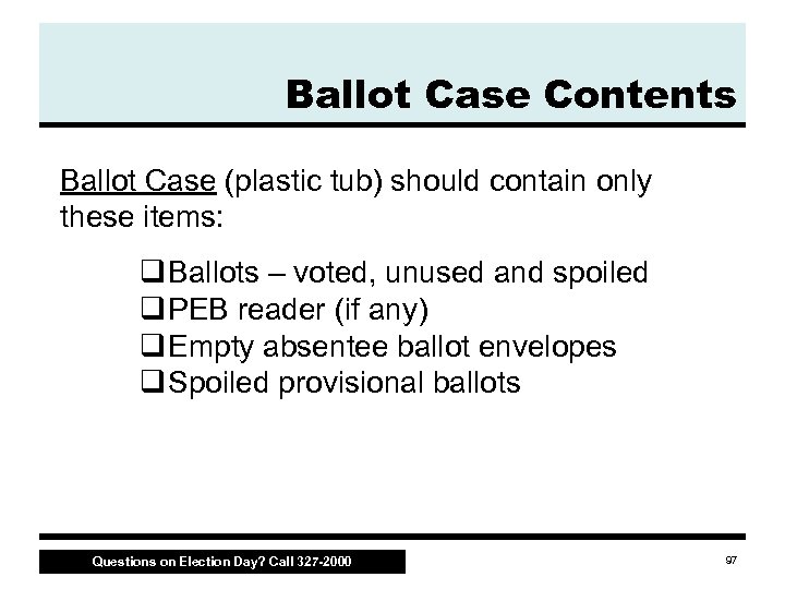 Ballot Case Contents Ballot Case (plastic tub) should contain only these items: q Ballots – voted, unused and spoiled q PEB reader (if any) q Empty absentee ballot envelopes q Spoiled provisional ballots Questions on Election Day? Call 327 -2000 97