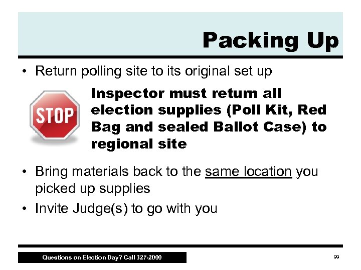 Packing Up • Pack up voting booths • Return items to inside of M 100, including the “Official Voting Site” yard sign(s) • Make sure i. Votronic is sealed – Use blue seal found in the Inspector Binder’s zipper pack – Leave voting booths, M 100 and i. Vo at polling location • Collect signs and posters – Put all items originally in Poll Kit back into the Poll Kit • Break down any ADA equipment, if applicable to your location Questions on Election Day? Call 327 -2000 98