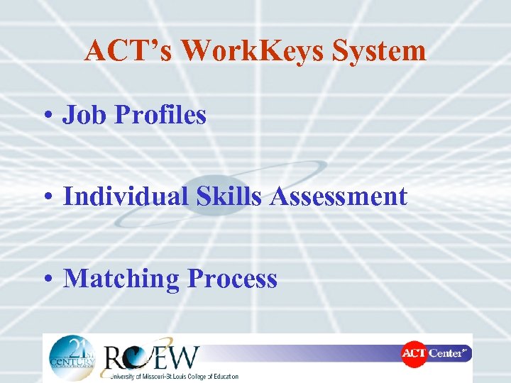 ACT’s Work. Keys System • Job Profiles • Individual Skills Assessment • Matching Process