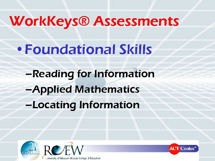 Work. Keys® Assessments • Foundational Skills –Reading for Information –Applied Mathematics –Locating Information