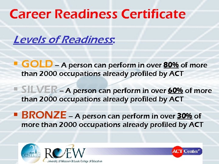 Career Readiness Certificate Levels of Readiness: § GOLD – A person can perform in over 80% of more than 2000 occupations already profiled by ACT § SILVER – A person can perform in over 60% of more than 2000 occupations already profiled by ACT § BRONZE – A person can perform in over 30% of more than 2000 occupations already profiled by ACT