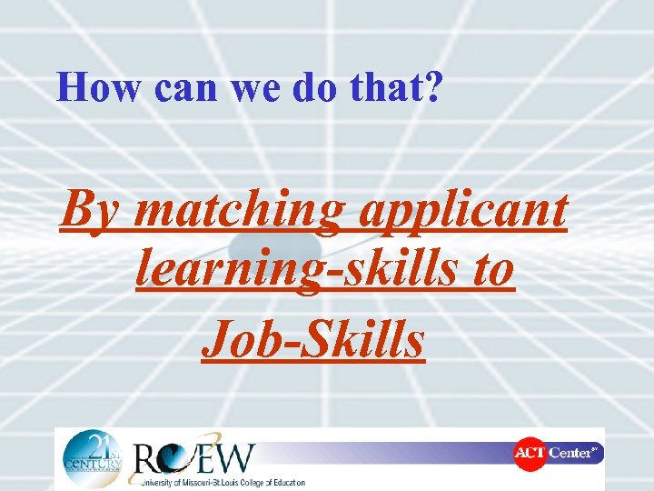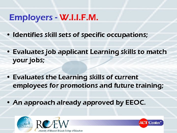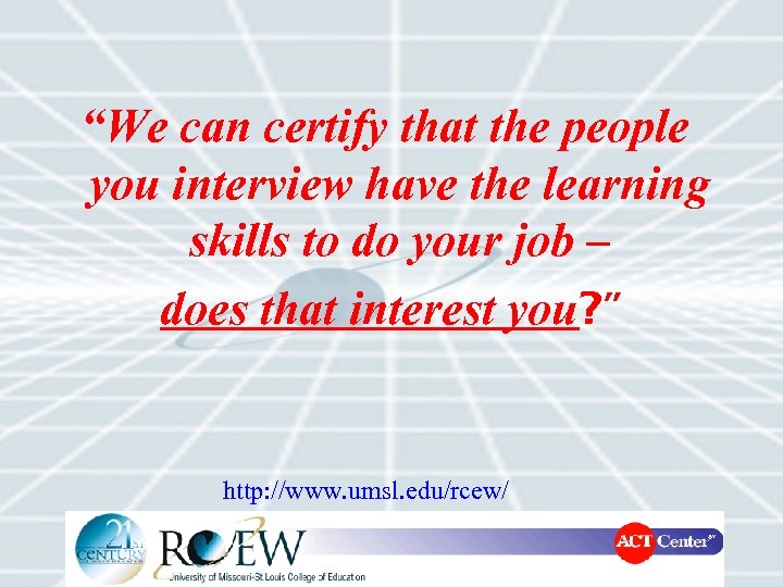 “We can certify that the people you interview have the learning skills to do your job – does that interest you? ” http: //www. umsl. edu/rcew/