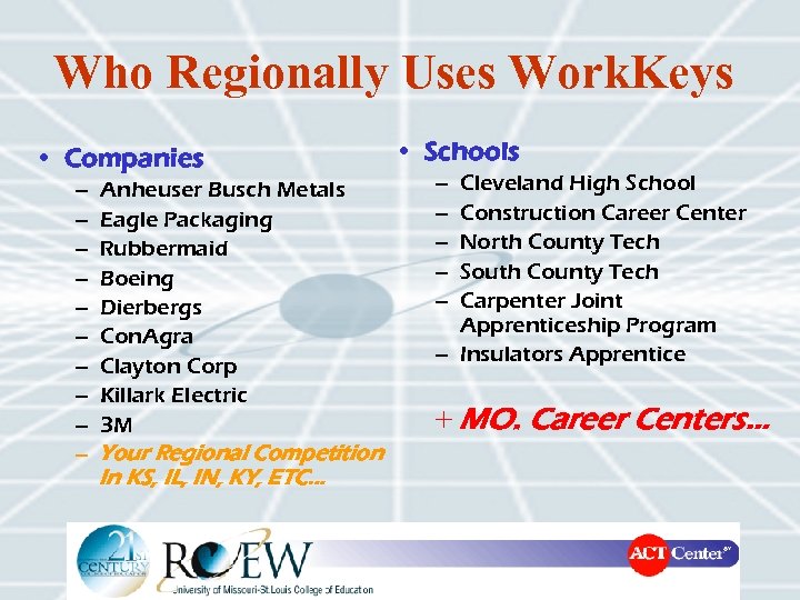 Who Regionally Uses Work. Keys • Companies – – – – – Anheuser Busch Metals Eagle Packaging Rubbermaid Boeing Dierbergs Con. Agra Clayton Corp Killark Electric 3 M Your Regional Competition In KS, IL, IN, KY, ETC… • Schools – – – Cleveland High School Construction Career Center North County Tech South County Tech Carpenter Joint Apprenticeship Program – Insulators Apprentice + MO. Career Centers…
