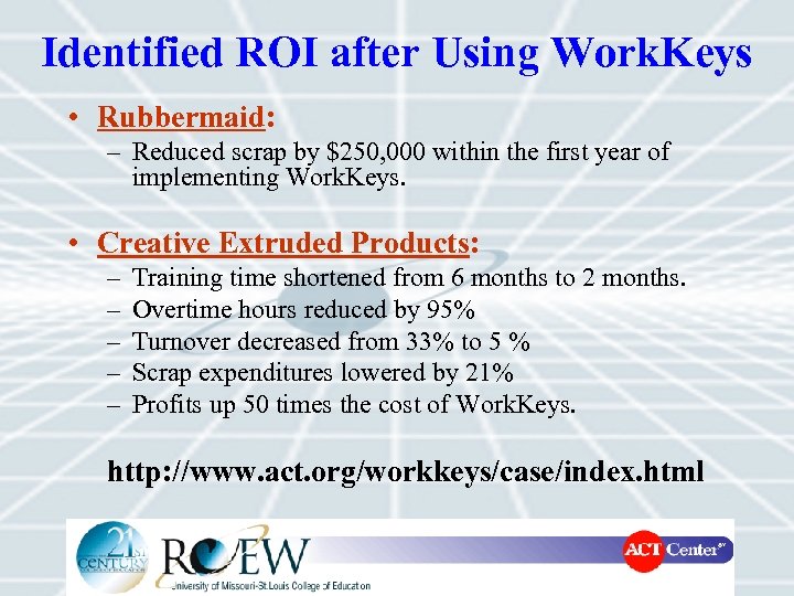 Identified ROI after Using Work. Keys • Rubbermaid: – Reduced scrap by $250, 000 within the first year of implementing Work. Keys. • Creative Extruded Products: – – – Training time shortened from 6 months to 2 months. Overtime hours reduced by 95% Turnover decreased from 33% to 5 % Scrap expenditures lowered by 21% Profits up 50 times the cost of Work. Keys. http: //www. act. org/workkeys/case/index. html