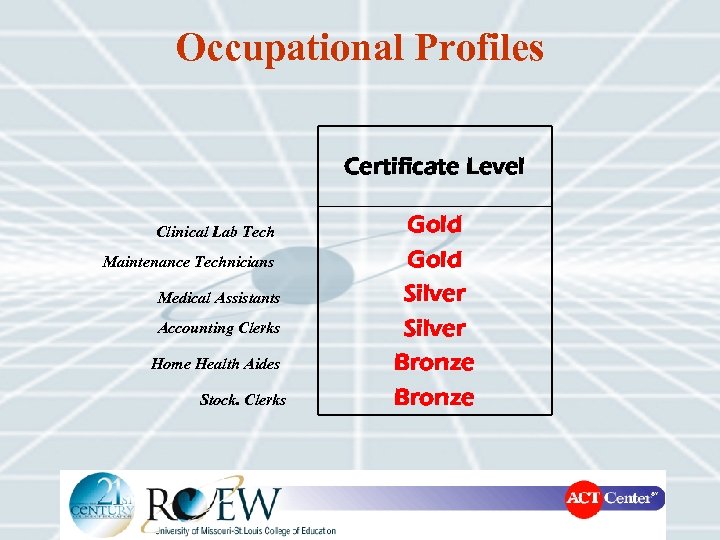 Occupational Profiles Certificate Level Clinical Lab Tech Maintenance Technicians Medical Assistants Accounting Clerks Home Health Aides Stock. Clerks Gold Silver Bronze
