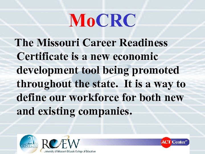 Mo. CRC The Missouri Career Readiness Certificate is a new economic development tool being promoted throughout the state. It is a way to define our workforce for both new and existing companies.