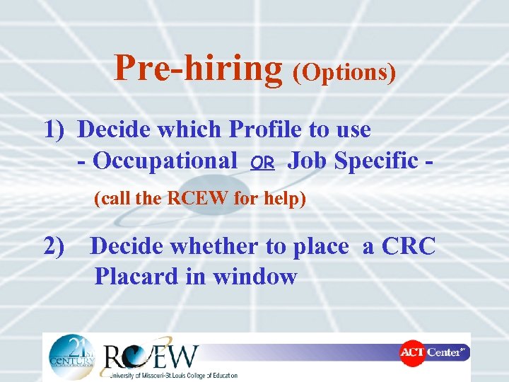 Pre-hiring (Options) 1) Decide which Profile to use - Occupational OR Job Specific (call the RCEW for help) 2) Decide whether to place a CRC Placard in window
