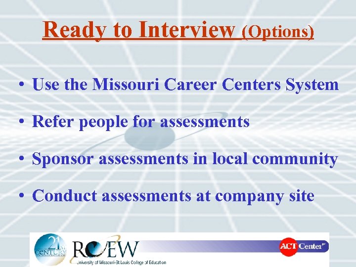 Ready to Interview (Options) • Use the Missouri Career Centers System • Refer people for assessments • Sponsor assessments in local community • Conduct assessments at company site